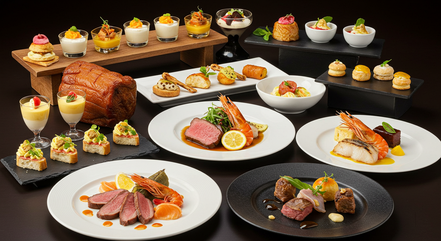 الوصف: تشكيلة مقبلات فاخرة (كنابيه، بط مدخن، روبيان)، أطباق رئيسية (لحم، سمك، دجاج)، حلويات فاخرة.